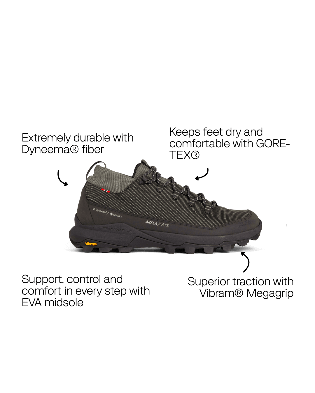 At just 438 g (EU 43), Aksla 2.0 delivers the perfect balance of agility and protection. Waterproof GORE-TEX®, durable Dyneema® and stable grip make it ready for long hikes and varied terrain.