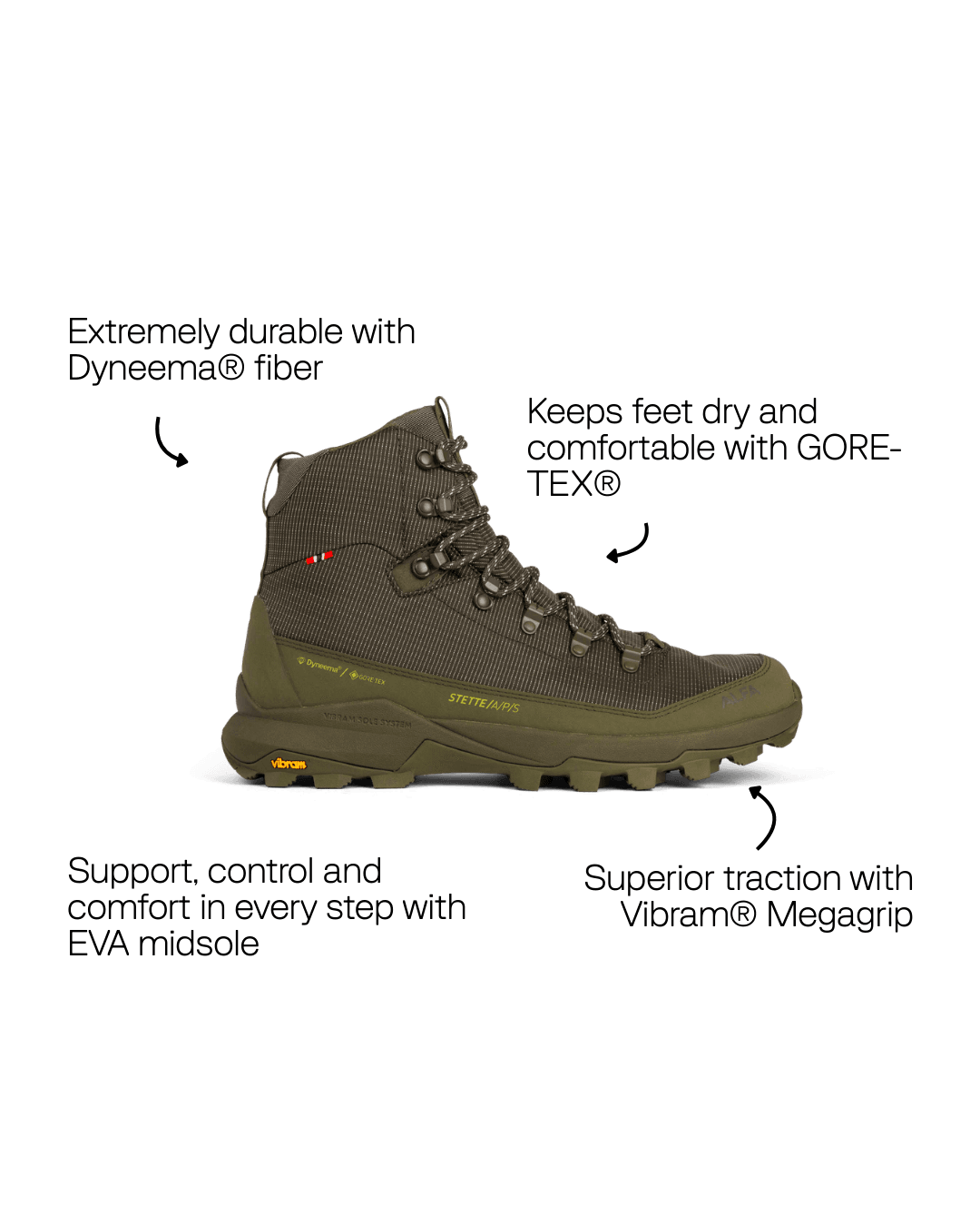 Stette is more than a lightweight hiking shoe—it’s built for long-term performance. By combining GORE-TEX® waterproofing, Dyneema® strength, Vibram® Megagrip traction, and a repairable design, it delivers comfort, protection, and sustainability. Backed by Alfa’s nearly 100 years of Norwegian bootmaking heritage, Stette is a smart and lasting investment for dedicated hikers.