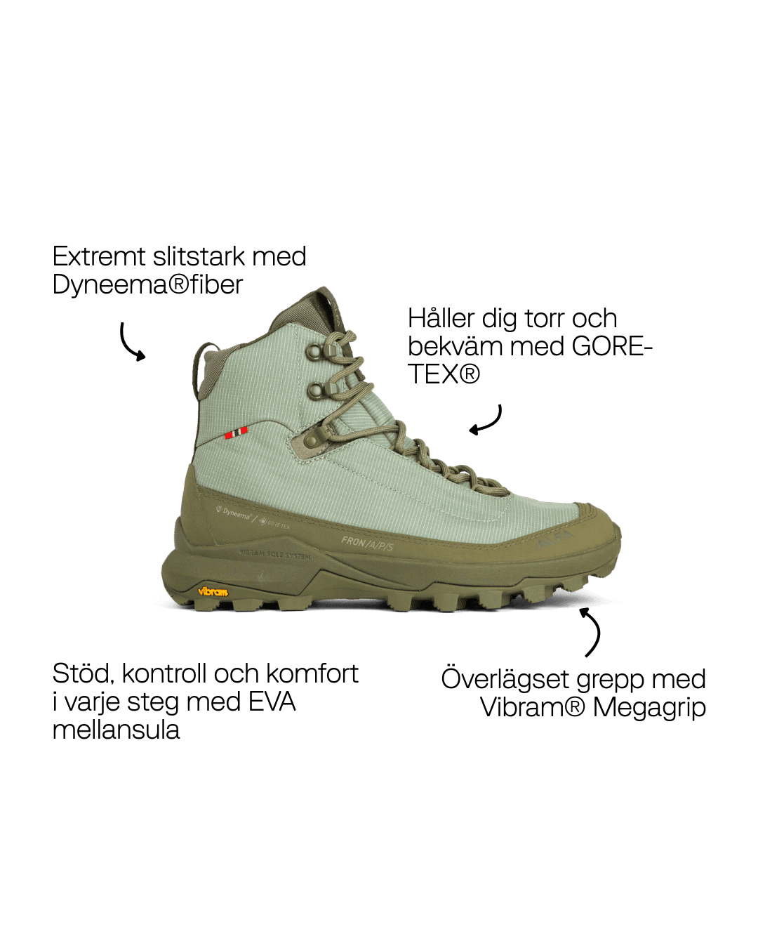 Our Fron 2.0 has a sewn galoshes for extra durability and improved protection in demanding terrain. The upper has also been made more flexible, providing increased comfort and a more natural feel while walking.