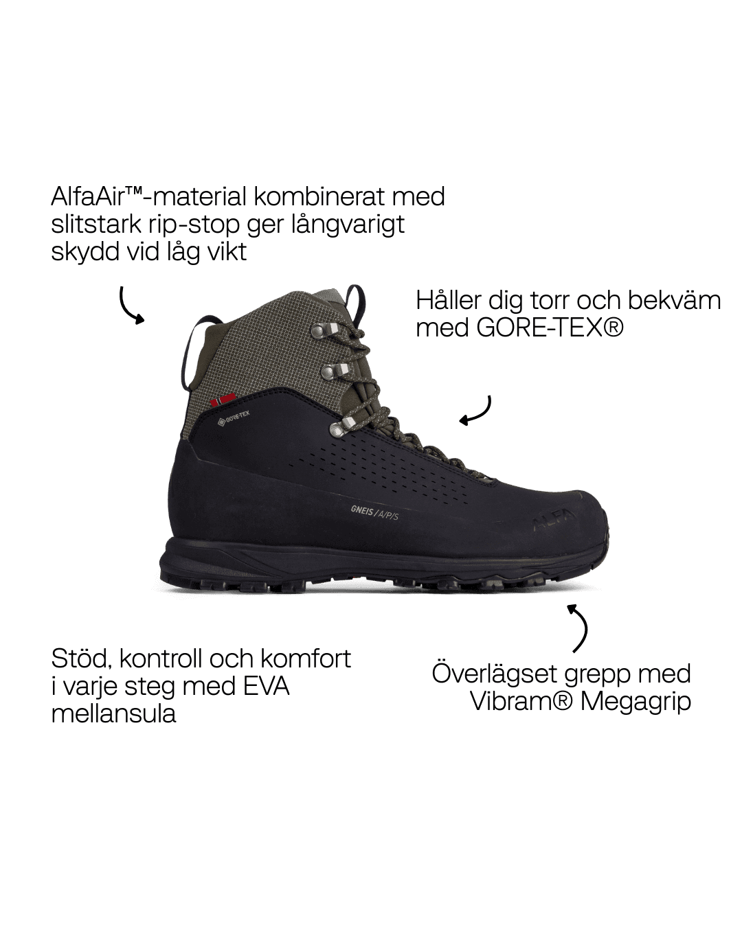Gneis has a regular fit and the ALFA Double Lock system makes it easy to adjust and adapt the fit to your feet. Combined with a lightweight EVA midsole, Gneis is built for comfort and is the perfect companion when your trail leads you through a wide range of terrain.