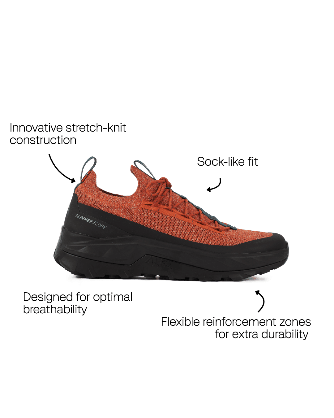 Glimmer pairs an innovative knitted upper with durable, lightweight, and breathable construction for unparalleled comfort and performance.