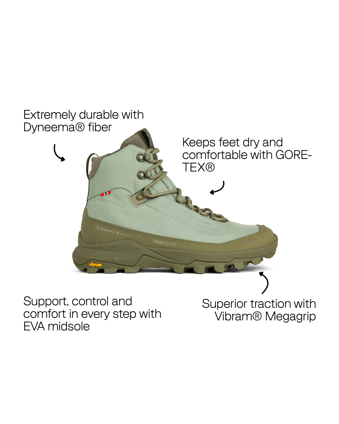 Dyneema® er et høyst innovativ fiber som er 15 ganger sterkere enn stål i forhold til vekt, samtidig som den er ekstremt lett og slitesterk. I Fron brukes Dyneema® i overdelen og i stretchgamasjen som omslutter ankelen. Resultatet er en sko som tåler utfordrende terreng, holder vann og smuss ute, og samtidig opprettholder et lett fotavtrykk — med forbedret holdbarhet.