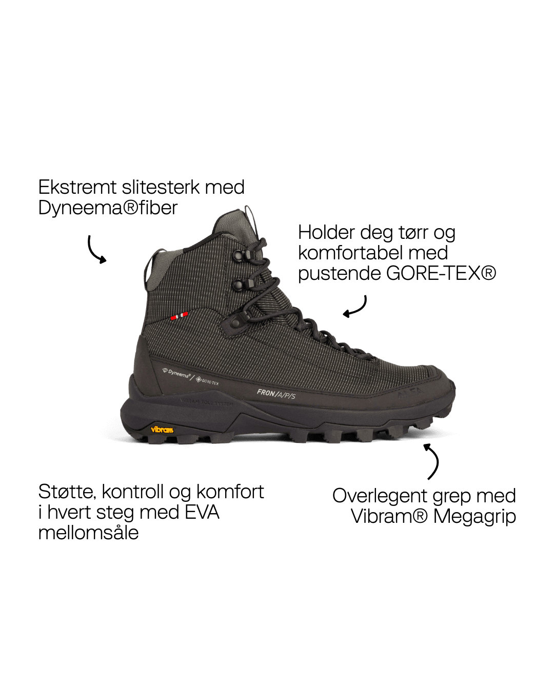 Dyneema® er et høyst innovativ fiber som er 15 ganger sterkere enn stål i forhold til vekt, samtidig som den er ekstremt lett og slitesterk. I Fron brukes Dyneema® i overdelen og i stretchgamasjen som omslutter ankelen. Resultatet er en sko som tåler utfordrende terreng, holder vann og smuss ute, og samtidig opprettholder et lett fotavtrykk — med forbedret holdbarhet.